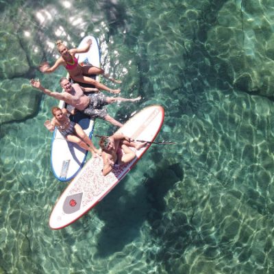 The yacht has a beach club. Down an elegant flight of steps you reach a platform that stands just above the waterline – ideal for swimmers. This can turn the whole aft area into a huge area for swimmers and sunbathers, or serve as a launch pad for divers and watersporters. The aft cockpit offers incredible entertaining space with multiple sunbeds and a very large dining table. The large forward cockpit has its own bar and a vast sunbed in order to balance the aft relaxation area Under the sunbed is a Jacuzzi. A perfect area to enjoy, relax and take in the sun. The flybridge takes on the mantle of an extra deck, the real story is the elegant wrap-around sofa which provides a really convivial spot for a big group of friends, or the whole family. The flybridges fully equipped with a full wet bar, as well as a plancha grill. She is equipped with a hydraulic platform which transforms to a very nice beach club on the water. Her fly bridge includes a dining area, Jacuzzi, wet bar and barbecue as well as sun beds. This luxurious crewed charter yacht offers a variety of water sports and toys, including sea bobs, paddle boards, wakeboards, snorkeling gear and many other fun water activities which will suit guests of all ages.