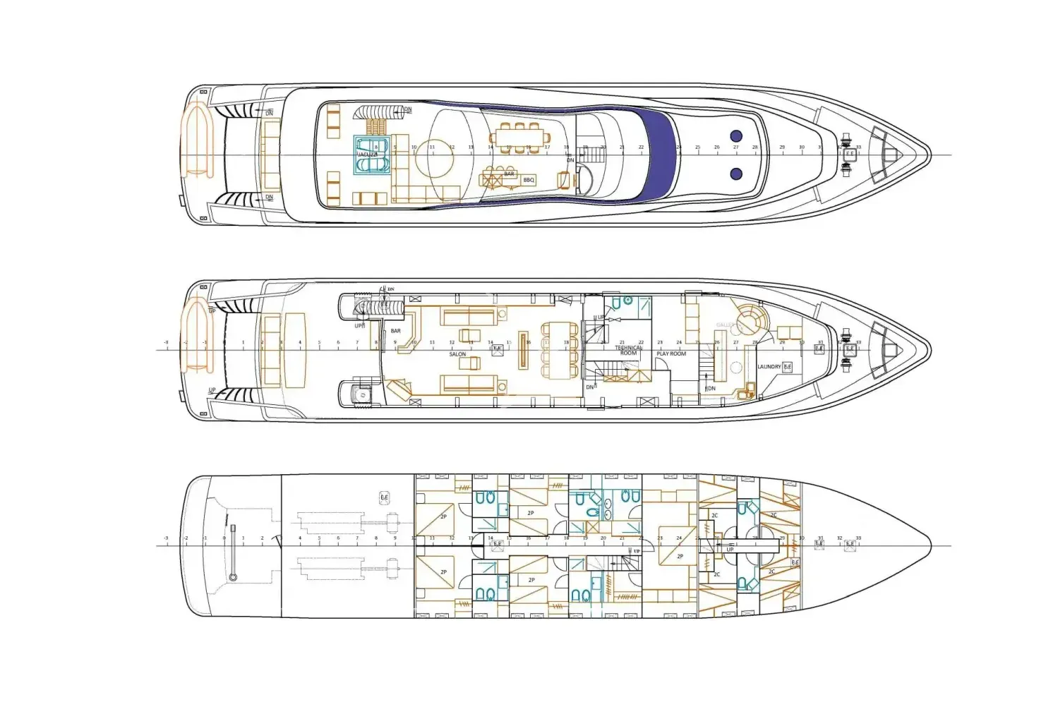 Engines: 2 X MTU 16V 4000 M90 Generators: 1 X ONAN 45KW 1 X ONAN 50KW Generator Consumption: 380 Ltrs./Day At Eco Speed 16 Knots: 550 ltrs/h Cruising Speed 21 Knots: 900 ltrs/h Max Speed 29 Knots