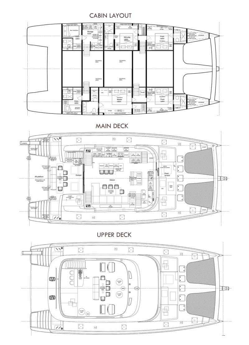 The hulls provide impressive volumes to set up a custom layout including airy, luxurious guest cabins and an opulent master suite with a walk-in dressing, desk, sofa, retractable TV and an immense bathroom. A perfect setting to unwind and relax after a long day in the sun.
