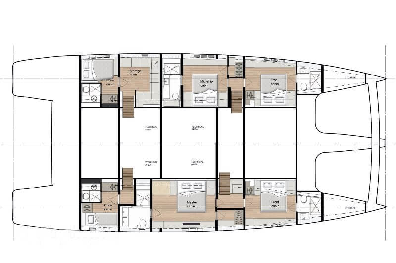 The hulls provide impressive volumes to set up a custom layout including airy, luxurious guest cabins and an opulent master suite with a walk-in dressing, desk, sofa, retractable TV and an immense bathroom. A perfect setting to unwind and relax after a long day in the sun.